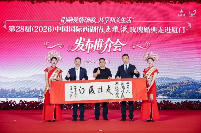 4月26日,第28届(2026)中国国际西湖情五粮液玫瑰婚典走进福建厦门,以“唱响爱情颂歌共享和美生活”为主题,精心打造了一场精彩纷呈的发布推介会、一场雅致温馨的浪漫嘉年华、一场美轮美奂的璀璨婚礼秀,内容丰富新颖,场景靓丽多彩。现场50对准新人、情侣欢聚一堂,沉浸式感受婚典和美爱情文化的内涵。