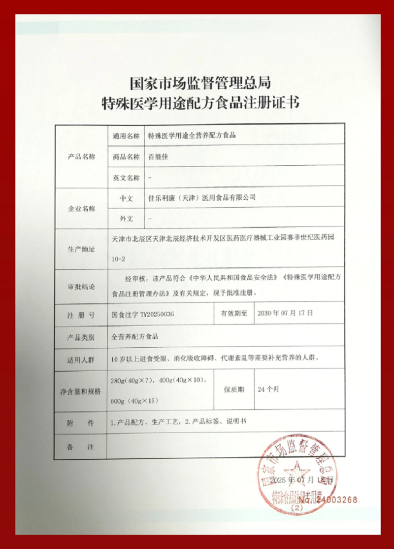 百能佳的成功上市,背后是严格审核与权威认证,其获批证书编号为国食注字TY20250036。作为一款特殊医学用途全营养配方食品,百能佳凭借全面均衡的营养配比,可作为唯一营养来源满足机体各类营养需求,将为术后恢复、慢病调理等有特殊营养支持需求的人群带来新选择。