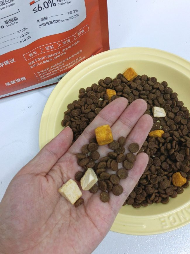 希喂家这款冻干猫粮拆袋就能闻到很自然的肉香味,猫咪闻到就知道是用好吃的肉做的。而且还有鸡肉冻干+蛋黄冻干,冻干颗颗完整不碎渣;主粮是牛肉+鸡肉的搭配,口感比起单一肉原料会更丰富一些,而且肉含量也扎实,难怪能抓住小猫咪的胃。