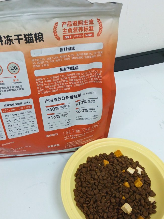 牛肉+鸡肉的搭配真的很科学,牛肉提供的蛋白质密度更高,还能补充铁、锌等微量元素,鸡肉则能够很好地打好营养基础,提供足量好吸收的动物蛋白,并且补充B族维生素,维持猫咪身体正常代谢;营养覆盖更加全面,实测粗蛋白44.57%、粗脂肪21.5%、牛磺酸0.35%。而且蛋黄冻干也能补卵磷脂,滋养猫咪毛发。