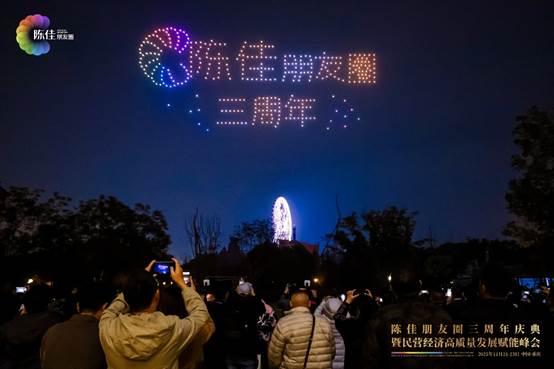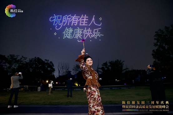 首先震撼全场的是无人机表演。数百架无人机腾空而起,在夜空中变幻出精美图案。当陈佳朋友圈的专属Logo在重庆夜空璀璨绽放时,全场嘉宾纷纷举起手机记录这震撼瞬间,欢呼声此起彼伏,彻底点燃了夜晚的热情。