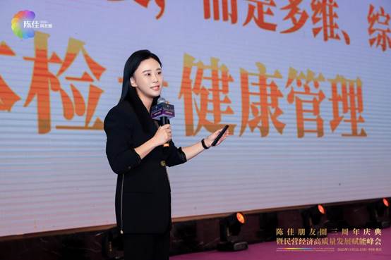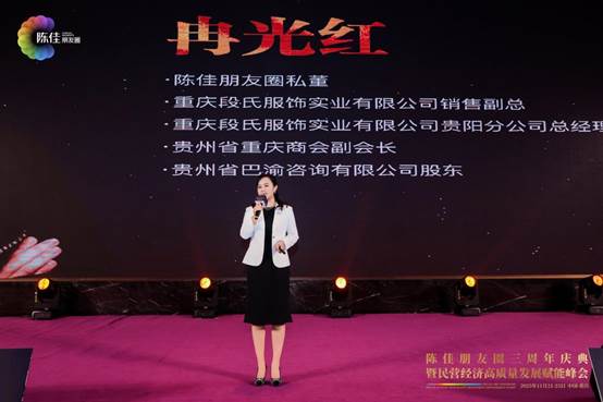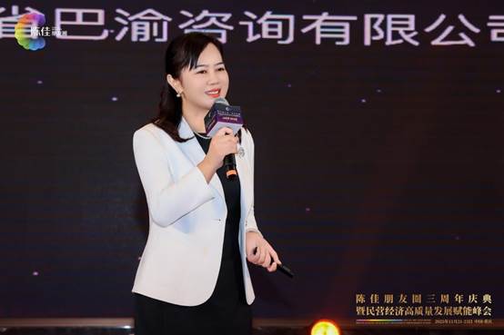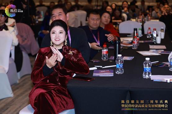 重庆市人大代表、学平大健康产业集团有限公司董事长彭学平女士在致辞中,对陈佳朋友圈三年来取得的非凡成就表示赞叹。她动情地评价,陈佳的成功绝非偶然,是她始终秉持“极致利他”的商业哲学,并以勤奋努力、追求卓越的实干精神去践行的必然结果。她特别指出,陈佳朋友圈积极参与公益的善举,不仅赢得了社会尊重,也为重庆企业家树立了良好形象。最后,她表达了对佳圈未来的美好祝愿,并期望在第四年能展开更深度的合作。