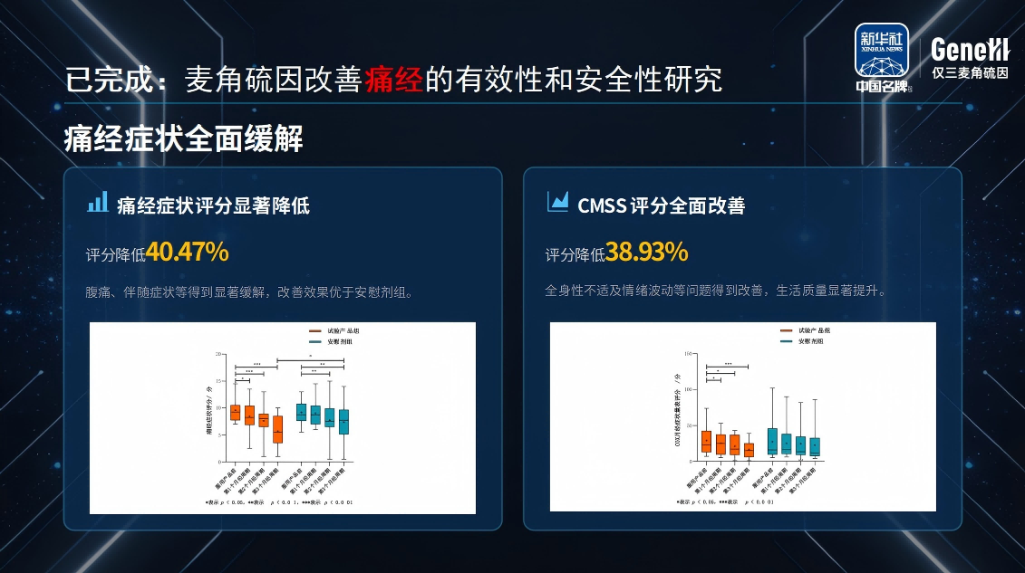 女性周期疼痛度最强VAS评分在3个月周期后显著改善52.63%(p<0.001),证明在缓解原发性痛经症状方面展现出显著潜力。