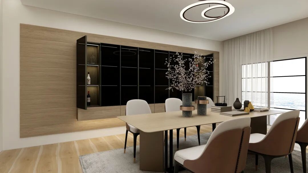 对于客厅与餐厅相连的户型,骊住采用模块化设计思维,将吊柜与隔断柜灵活组合。隔断柜即有空间划分的效果又可实现双面收纳,吊柜则存放红酒、茶具等展示性物品,既避免收纳空间浪费,又确保物品取用便捷。