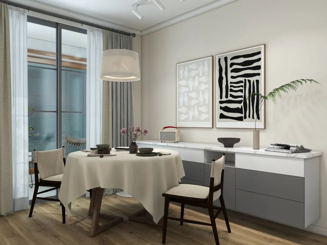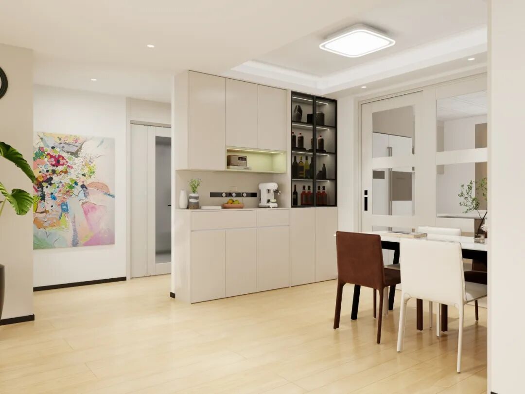 骊住定制收纳的上墙式边柜,打破了传统落地边柜对地面空间的占用限制,尤其适配小户型餐厅或动线紧凑的空间布局。一方面,其悬浮式结构可保留柜体下方的地面区域,既避免落地柜体易积灰、难清洁的问题,又能为餐厅预留更多活动空间。