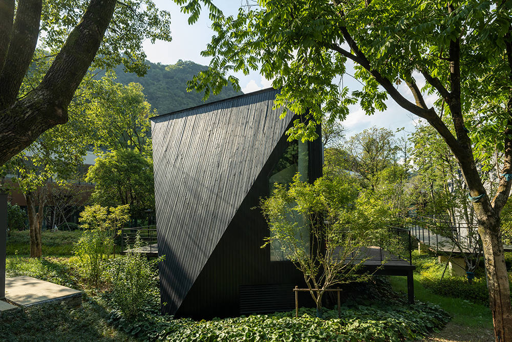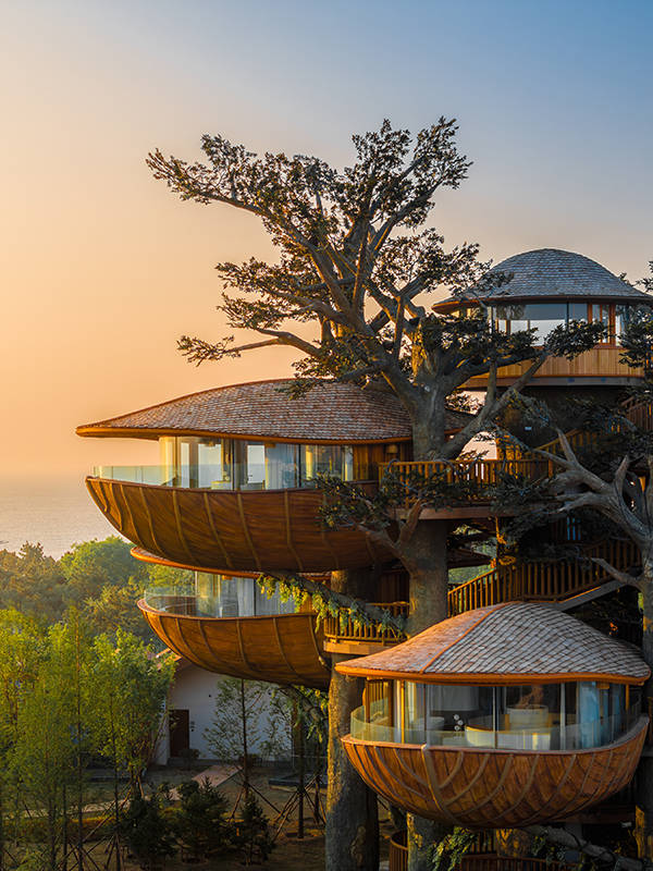架空设计的海螺屋客房隐于林间,如同童话故事中的精灵居所,为住客营造出私密而梦幻的休憩空间;天文台客房悬于岩壁之上,通过客厅的望远镜和全景天窗可赏星河美景,将浩瀚星空引入室内;炭晶舍客房以传统炭雕艺术为灵感,通体的炭黑色艺术感十足,展现出材料与自然的深度对话;复式结构的玉江舍客房,则让宾客在空间转换中,收获山川、江潮等不同的观景视野,实现移步换景的居住意境。