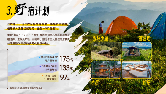 个性小众的特色野宿:携程数据显示,在2025年东南亚旅行订单中,选择"特色住宿"的用户同比增长175%,“木屋”和 “露营地”住宿订单分别增长97% 和133%。