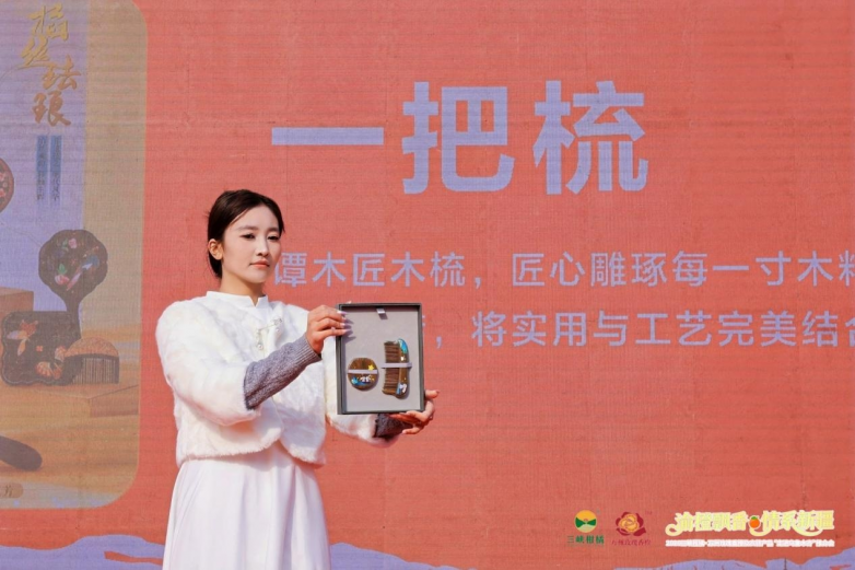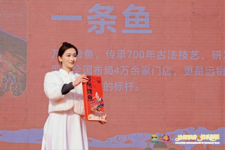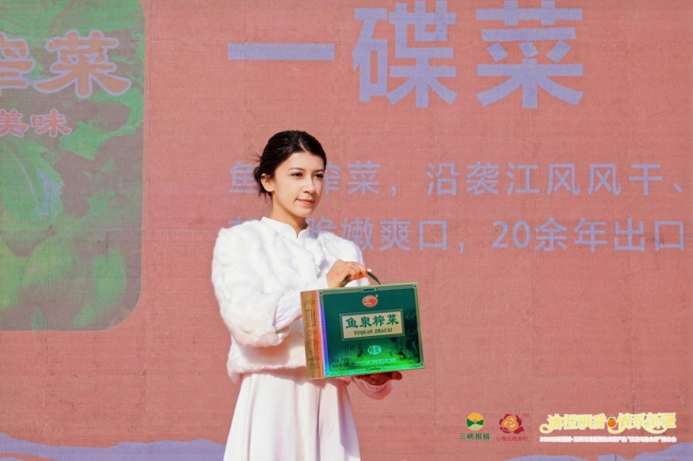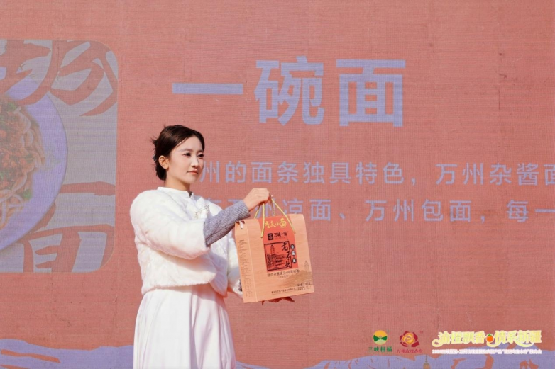 活动现场重点推介了万州农特产品“九张金名片”,涵盖:一枚果(古红桔、玫瑰香橙、青柠檬);一壶酒:诗仙太白酒;一碟菜:鱼泉榨菜;一碗面:万州面(杂酱面、牛肉面、凉面、包面等);一叶茶:三峡天丛;一条鱼:万州烤鱼;一瓶油:树上鲜花椒油等调味品;一把梳:谭木匠木梳;一段锦:三峡绣等品类。