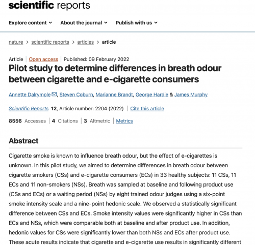 研究团队表示:“我们的研究结果表明,与传统香烟相比,电子烟使用者的口气异味更少,气味更令人愉悦,与非吸烟者相当。这表明,对于戒烟或完全转用电子烟的烟民来说,也许能带来改善口气的益处。”