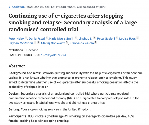 研究者在论文中表示:“本次研究采用了有代表性的样本数据,通过严格设计标准和客观结局指标,为人们科学认知电子烟在维持戒烟效果中的作用,提供了新的循证医学证据。”