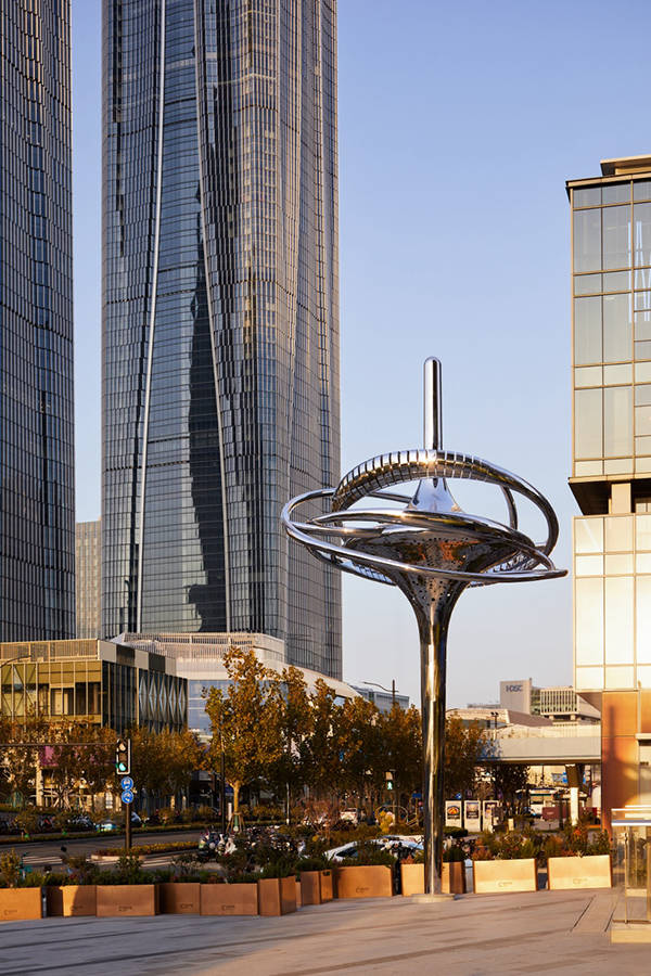 在陆悦天地的入口处,艺术家王光旺的大型装置作品《时光之迹》亭亭而立。这枚优雅的陀螺天体,仿佛时间之轮缓缓展开,其表面映照出周围的景物,又在反射的时空中将其汇聚。