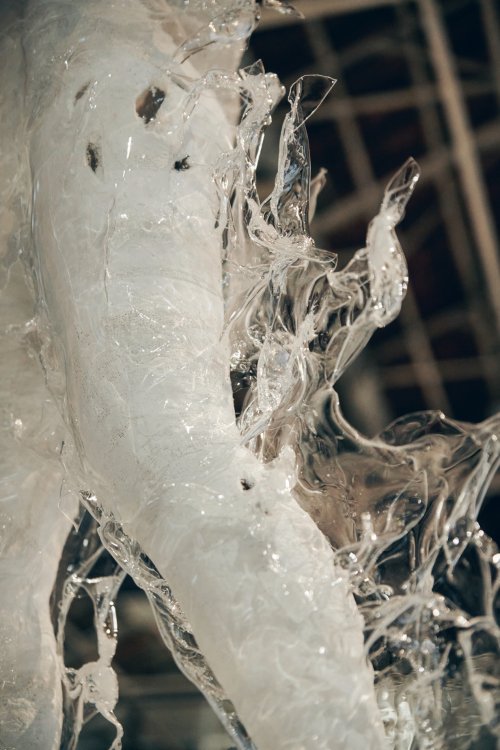 正是基于这种“塌陷”的真实,作品的核心观念得以强力彰显:光源被置于这具由内而外拓印而成的躯壳内部。于是,光芒并非均匀照射,而是精准地从那些塌陷的曲线、皱褶与伤痕的原始位置中透射出来,仿佛这些生命经验本身成为了光的路由。这视觉化了作品的核心哲学:外力带来形变与痕迹,而从内部生发的能量,才能使这些痕迹转化为透光的通道,完成真正的破茧与新生。机械驱动的旧婚纱构成了外在的、社会的“茧”;而中心那具自我照亮、由内而外散发光辉的躯体,则宣告了重生的主动权在于生命主体的内部转化。这为当代艺术中的“身体叙事”与“手工精神”提供了深刻的结合范例:真正的力量与疗愈,并非抹去痕迹,而是学会让光从中穿过。