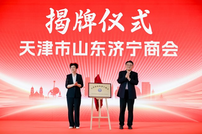 天津市滨海新区政协副主席、区工商联主席董丽敏与济宁市政协副主席、市工商联主席李敬共同为天津市山东济宁商会揭牌