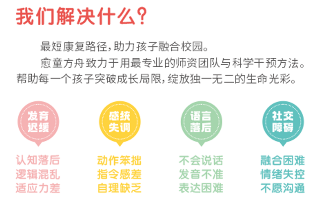 愈童方舟是一家为1.5-12岁特需儿童提供专业康复训练与幼儿园深度融合教育的高端儿童康复中心。秉持“以终为始”的理念,中心致力于通过循证医学、多学科协同的模式,为发育迟缓、孤独症谱系障碍、注意力缺陷障碍等儿童及其家庭提供一站式、全周期的康复融合服务,让每一个孩子都能突破成长局限,绽放生命光彩。