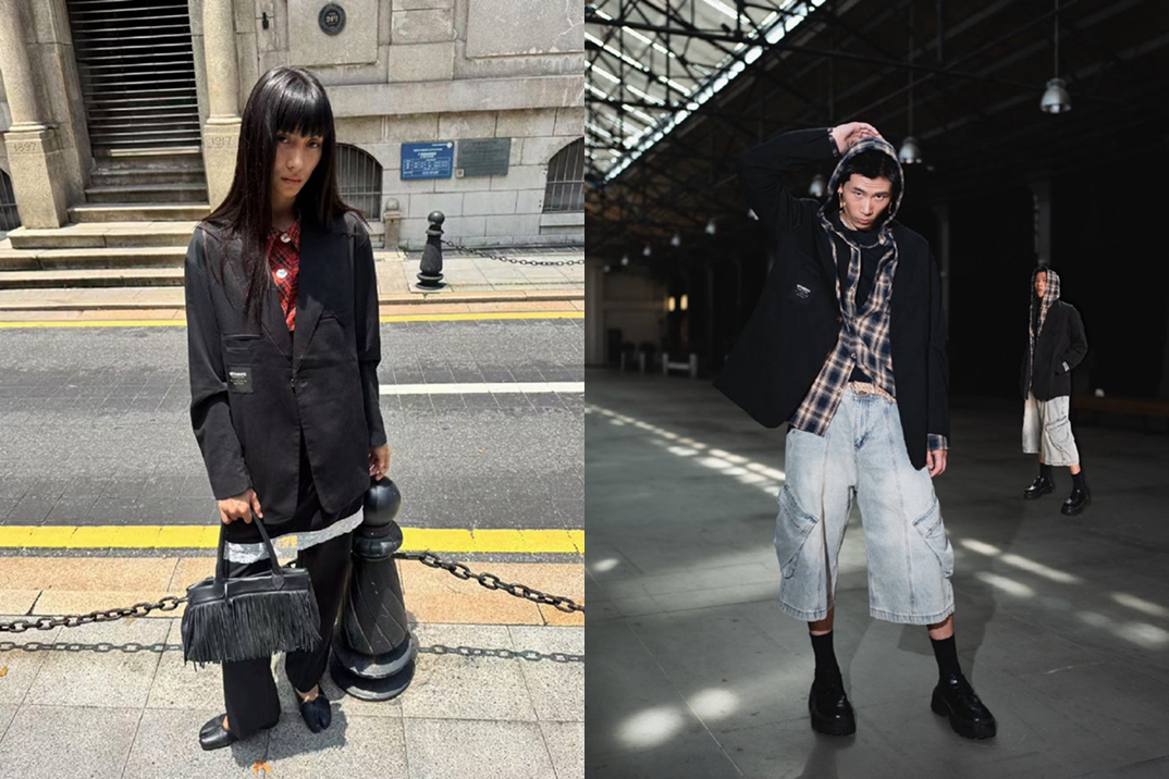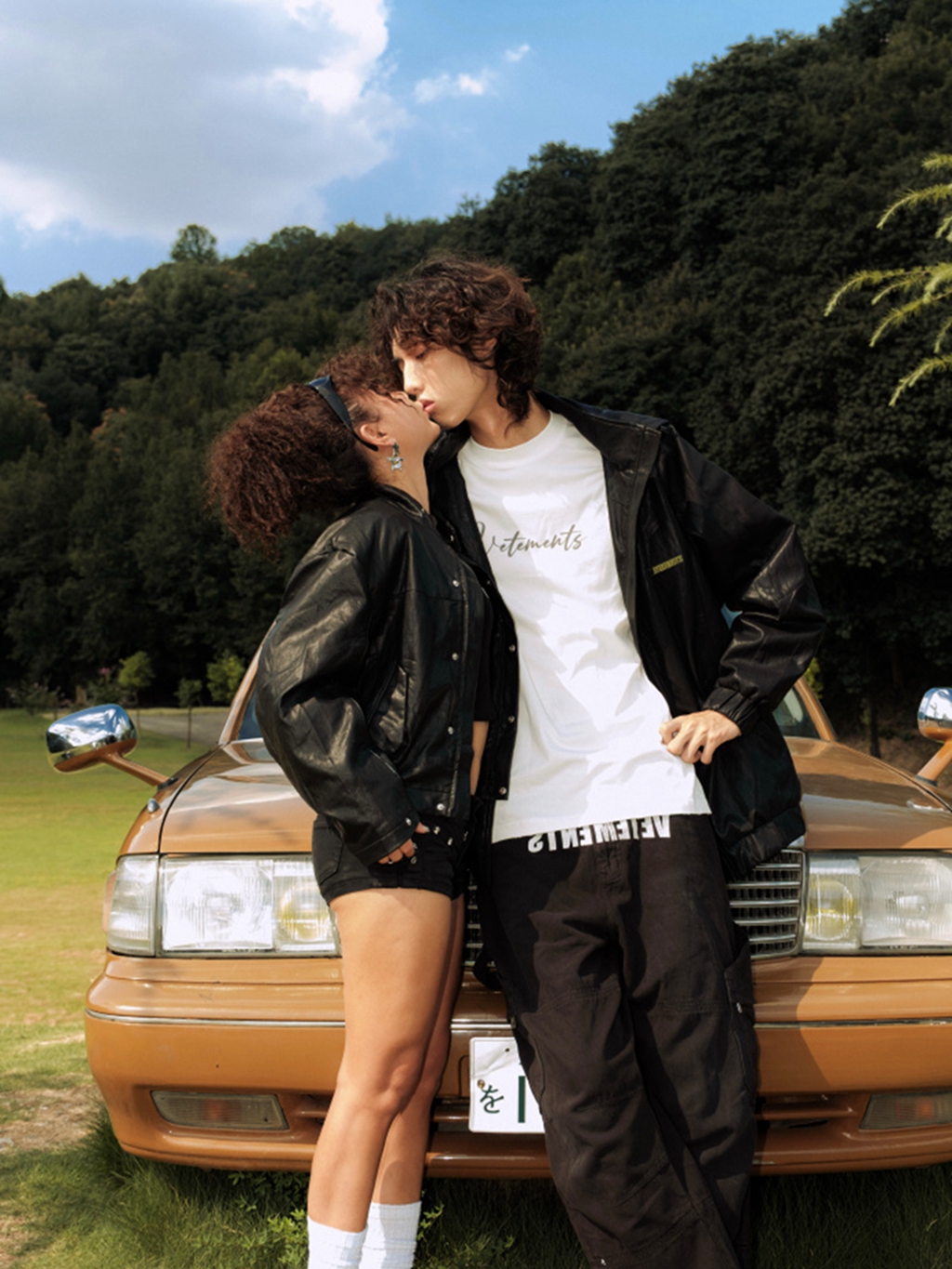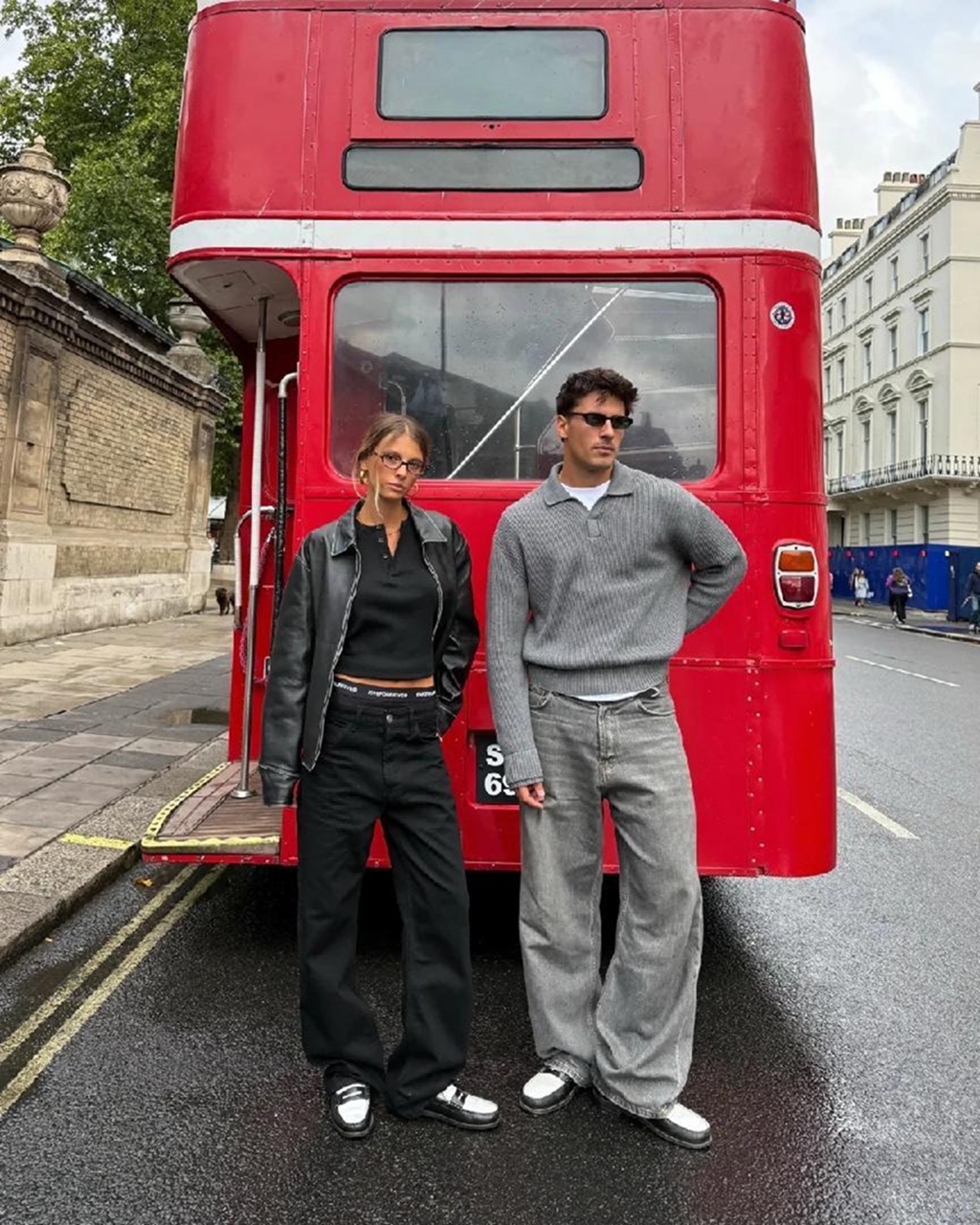 VETEMENTS黑灰系基础款叠搭复古中带着时髦,短款皮夹克+露腰内搭+黑色超短裤,或是针织polo叠白T+浅灰牛仔,统一鞋款连CP感都能穿出来,高级利落还绝不踩雷。