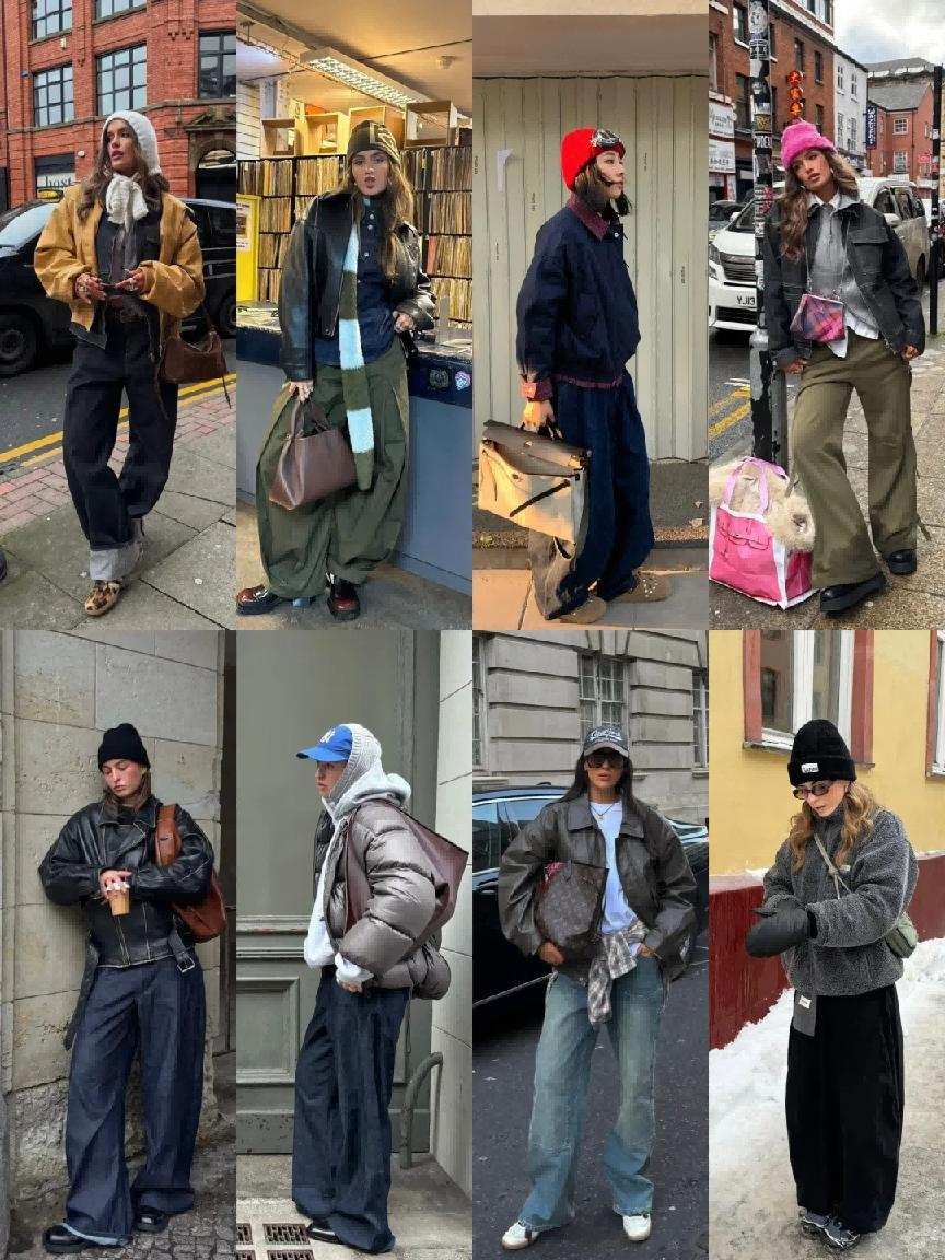 皮夹克、羽绒外套这类“有型款”,叠宽松卫衣或简约内搭,搭阔腿牛仔/工装裤,再戳点帽子、耳机小配饰,酷感里裹着随性,街头感和质感都没落下。