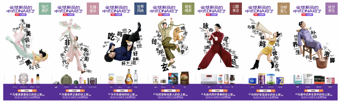 今年双11期间,天猫国际打造了“全球新品的中式DNA”系列主题传播。以独特的中式DNA带来的有趣共鸣为切入点,上线海外新品的趣味图鉴;以“萌宠喂养”单元为例,除了聚焦科学养宠,深层传递了中式家庭情感——“爱宠取名可以靠玄学,喂养必须看成分和科技”,精准戳中养宠人共鸣,也让海外优质宠物食品及保健品更顺其自然地被关注和种草。图鉴传播渗透全国商圈、地铁等场景,精准触达一二线城市核心消费群体,霸屏上海“亚洲第一巨幕”更是自带打卡及社交传播属性。