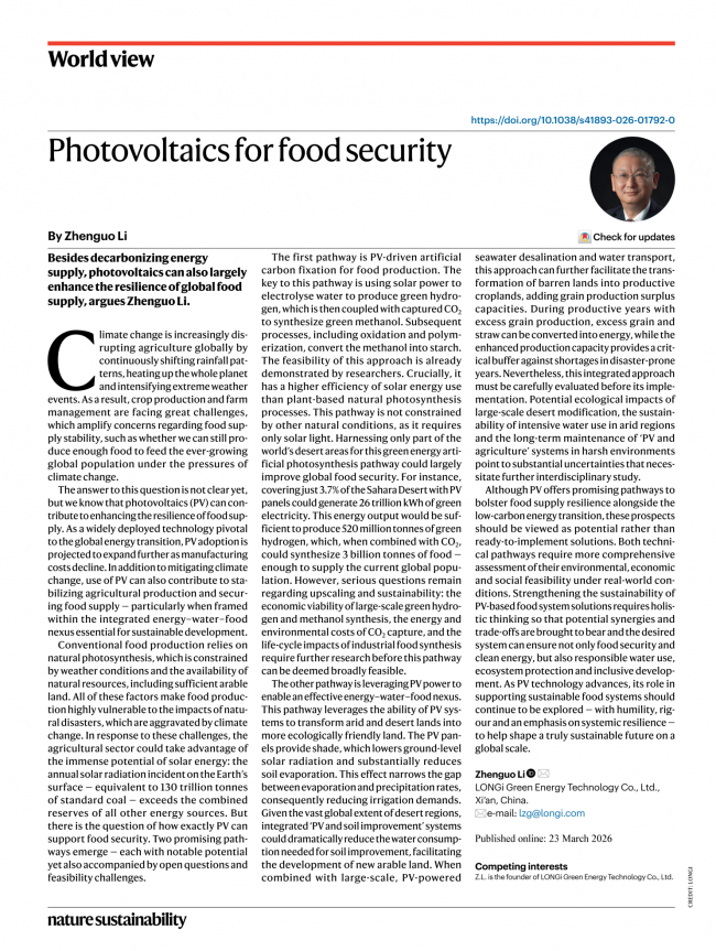 近日,隆基绿能创始人、首席技术官李振国在国际顶级学术期刊《自然·可持续发展》(NatureSustainability)上发表题为《光伏技术助力粮食安全》(Photovoltaics forfoodsecurity)的前瞻性观点文章。文章系统阐述了光伏技术在提升全球粮食供应韧性方面的巨大潜力,并提出了两条具有应用前景的技术路径,展现了光伏在能源转型之外,对全球可持续发展的重要支撑作用。