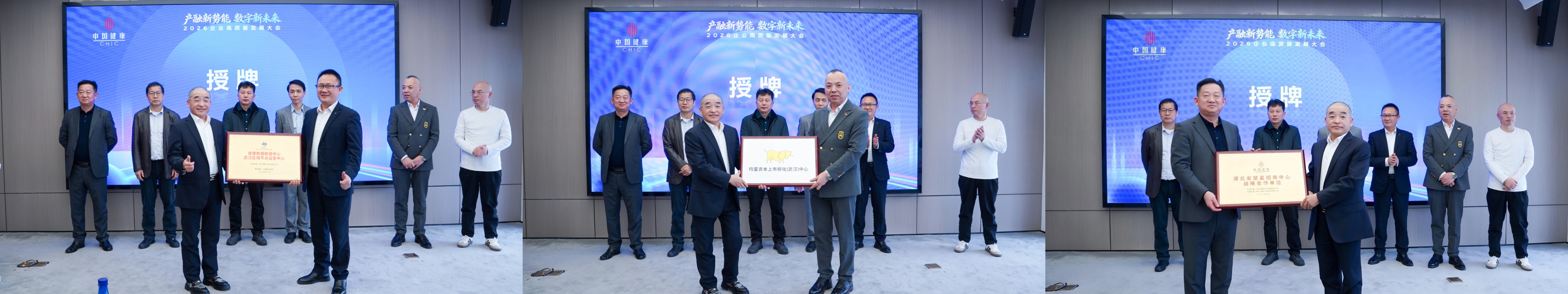 在随后举行的开幕仪式上,上海数据交易所健康数据数纽中心正式向中健云隆(湖北)健康产业科技有限公司、中健优睡纪元(湖北)数字科技公司授牌,标志着数据资产化在健康领域的深度落地;紧接着,中健云隆向湖北省楚星招商中心授牌,双方将携手推进产业服务与资源整合。授牌的完成,为数据资产化与产业服务合作注入了实质性动能,奠定了产业落地的坚实基础。