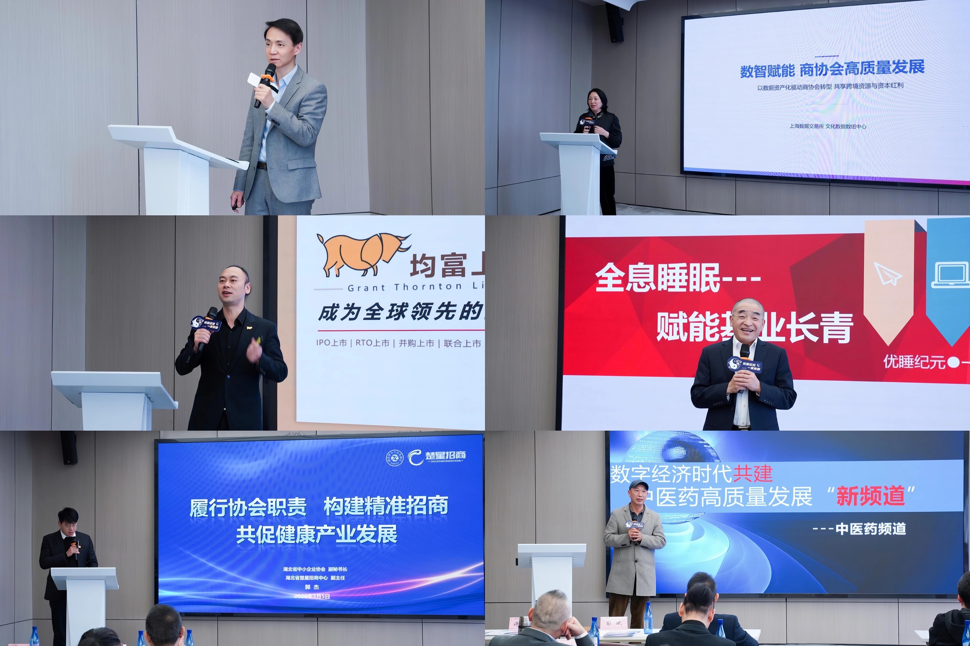 主题演讲环节亮点纷呈。上海数据发展科技有限公司副总裁高翔先生以《激活数据资产价值——解锁企业数字化转型,赋能长效增长》为题,剖析数据要素在企业升级中的核心驱动作用;上海数据交易所健康数据数纽中心执行主任谢议萱先生围绕《赋能商协会数字化转型新风口》,分享数字化平台助力资源整合的创新实践;香港均富资本副总裁谭金周先生在《产业投资新风口与资本赋能》中,解析资本布局健康产业的战略机遇;中健云隆(湖北)公司董事长李清先生以《聚焦企业家全息睡眠健康——搭建健康管理与产业融合》为题,重磅发布数字睡眠管理方案;湖北省楚星招商中心副主任郭杰先生围绕《履行协会责任,构建精准招商,助力企业发展,服务地方经济》,阐述招商服务对产业落地的支撑作用;中医药频道运营中心主任刘平先生带来《中医药频道创新融合,助力企业高质量发展》,展现传统医学与数字化融合的创新生态。