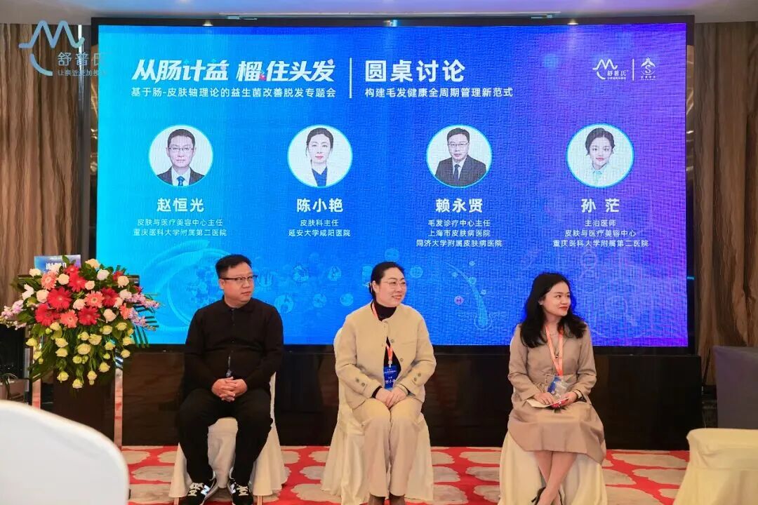 会议特邀重庆医科大学附属第二医院皮肤与医疗美容中心主任赵恒光教授、延安大学咸阳医院皮肤科主任陈小艳教授、上海皮肤病医院/同济大学附属皮肤病医院毛发诊疗中心主任赖永贤教授、重庆医科大学附属第二医院孙茫教授、杭州百芮集团创新研发中心研发副总谢佩珊博士等权威专家及30位医生、客户莅临现场,通过线上直播+线下分享的形式,围绕肠道微生态与毛发健康的前沿联系展开深度对话,系统阐释了舒菌丝语秃秃芯益生菌咀嚼片的科学内核及54321毛发全周期管理体系的临床落地价值。