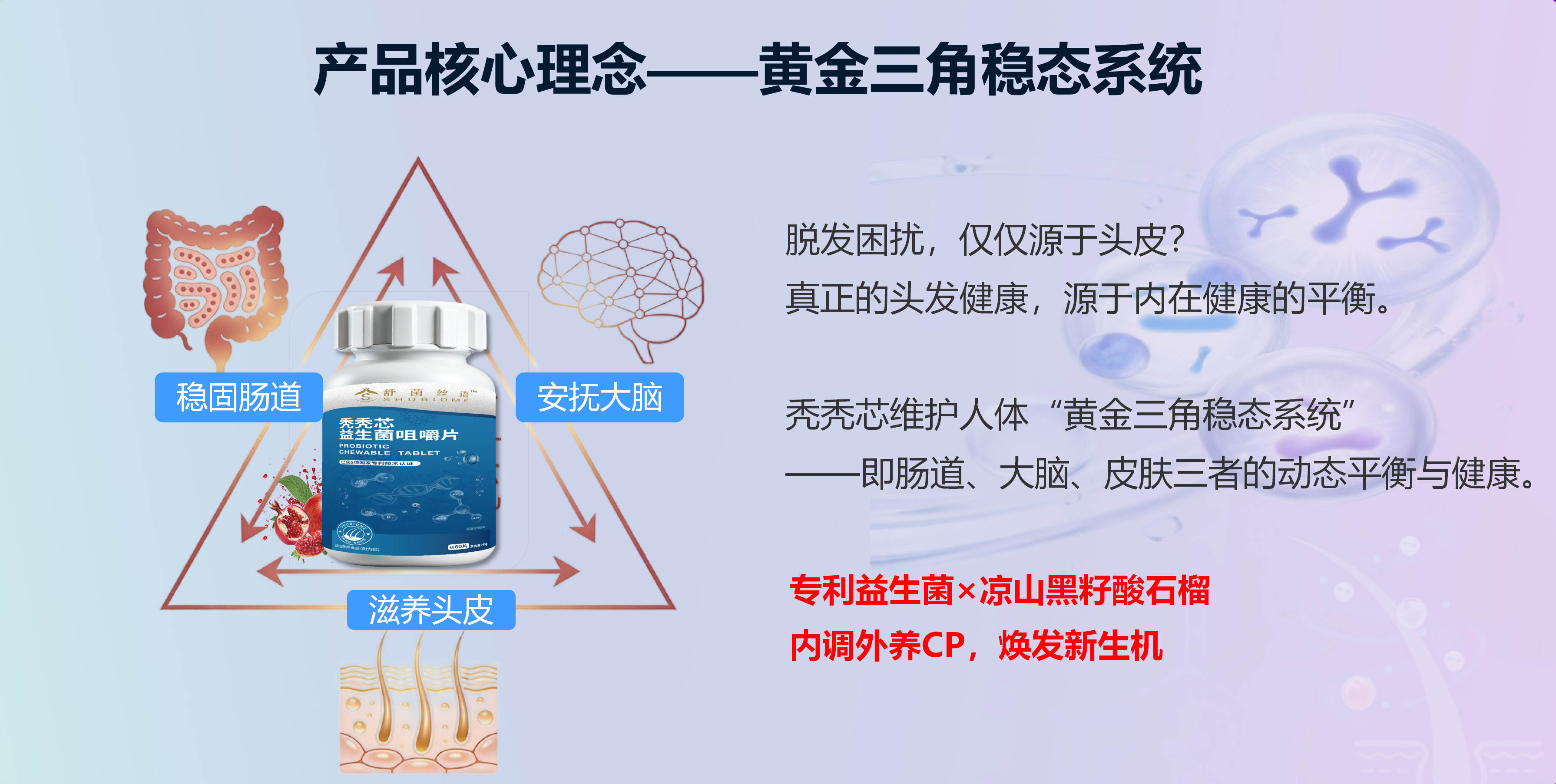 专利益生菌+益生元+后生元:维持肠道微生态健康,内养根基,给头皮“养好菌群”,让它更健康。