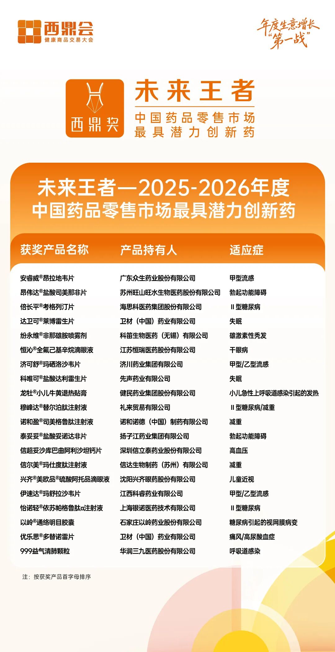 “未来王者”奖项围绕创新性、市场潜力两大维度,构建客观量化评选体系,遴选出具备功效突破、填补市场空白属性的潜力创新药。本届共有20款产品上榜,涵盖抗感染、代谢与慢病、男性健康、皮肤用药等多个高增长赛道。