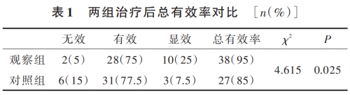 治疗后,西黄组总有效率为95%,对照组总有效率为85%(P<0.05)。见表1。