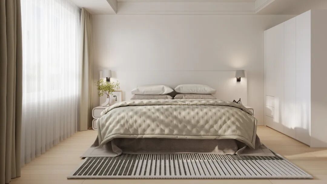 主卧室以“静谧、舒适且功能完备”为核心设计理念,在延续骊住全屋定制纯净氛围的基础上,创新利用骊住定制收纳柜隔断出独立衣帽间。这一设计不仅实现了空间的高效分区,更将收纳能力最大化,令休憩区与储物区彼此独立、互不干扰,充分诠释了极简风格的高效与精致美学。