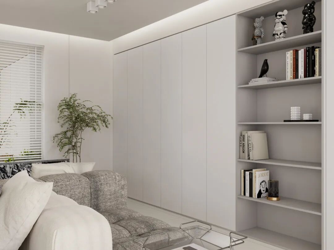 书房作为居家办公与阅读的重要场所,本案例在此打造了一个“专注办公+轻松休闲”的双重功能空间。纯白色的墙面与天花板,搭配骊住定制收纳书桌与柜体,地面通铺纯白色骊住地板,整个空间没有多余色彩干扰,与休闲沙发的柔和线条,营造层次与惬意感。在骊住整体规划下,书房既能满足高效工作与阅读的需求,亦成为放松身心的舒适角落,真正实现了功能与美学的平衡。