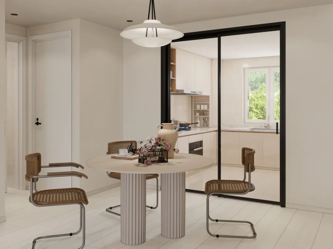客餐厅共处同一空间中,未做明显的区域划分,意欲打破空间界限,让整个区域显得更加开阔通透。厨房入口安装一扇通透明亮的骊住铝合金双拉门,简约沉稳的黑色门框更显时尚、大气,自然光感十足,与骊住全屋定制的整体设计语言相呼应,让空间更显明亮温暖。