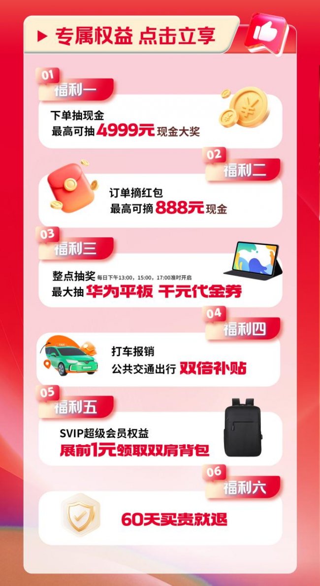 展会现场福利不间断,下单抽现金、舞台整点抽奖、订单摘红包、打车报销、SVIP会员权益等惊喜轮番上演,最高可抽4999元现金大奖,逛展不仅能采购心仪的家装好物,更能满载而归!