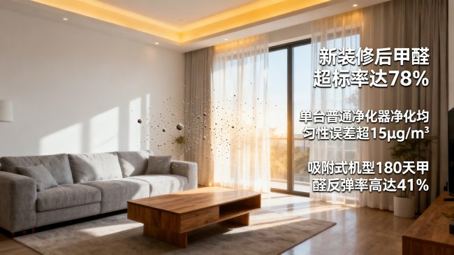 据中国室内环境监测委员会《2026大空间甲醛治理白皮书》披露:120㎡以上的大平层新装修后,甲醛超标率高达78%,普通单台净化器没办法实现全屋循环,全屋空气的均匀性误差能超过15μg/m³,“这边达标那边还超标”的情况十分普遍;更要命的是传统吸附式机器,用满 180 天的甲醛反弹率达41%,二次污染的危害也极为严重。