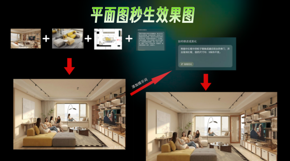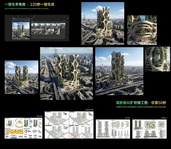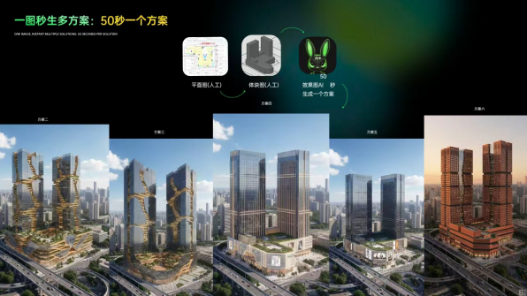 •极速交付: 用户只需输入自然语言指令,即可直达创意结果。从平面活模型到效果图渲染、甚至扩初施工图输出,全流程仅需 几分钟。