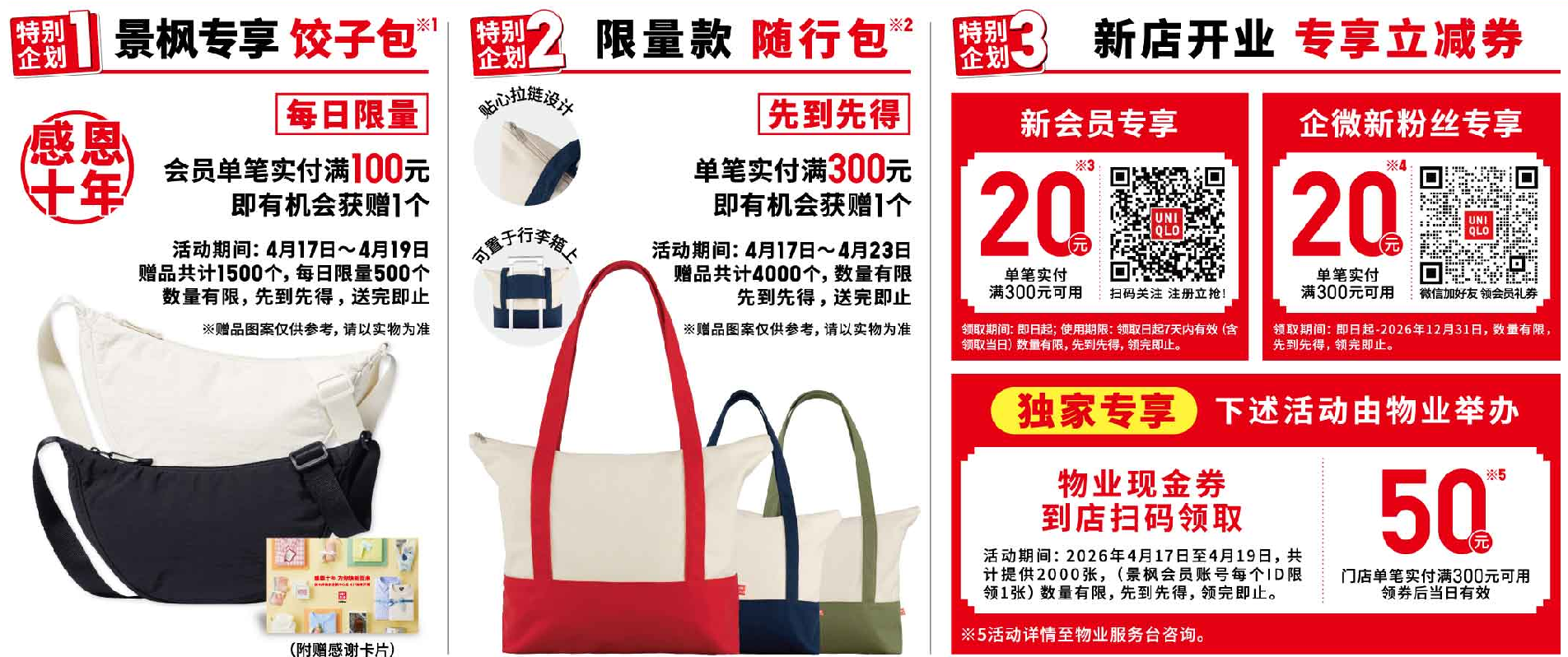 • 共庆景枫十年相伴,多重好礼限量开抢!4月17日至4月19日,会员单笔实付满100元即有机会获赠爆款优衣库饺子包,每日限量500个,赠完即止;景枫会员同步可领取“满300减50”物业现金券。4月17日至4月23日,单笔实付满300元即有机会获赠限量款随行包,先到先得,送完即止。