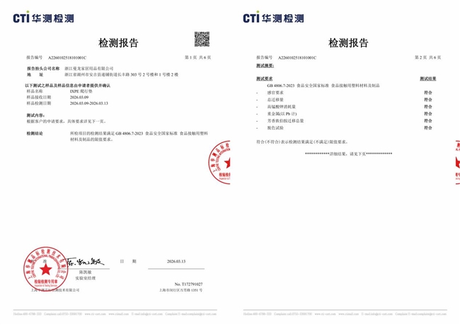此外,上海华测检测技术有限公司依据GB 4806.7-2023《食品安全国家标准 食品接触用塑料材料及制品》,对曼龙IXPE爬行垫进行检测。结果显示,产品在感官要求、总迁移量、高锰酸钾消耗量、重金属、芳香族伯胺迁移总量及脱色试验等项目上均符合标准限值,材质安全达到食品接触用塑料材料的规定。这一指标进一步贴合低龄儿童啃咬、舔舐物品的实际使用场景,为家长提供更安心的选择。