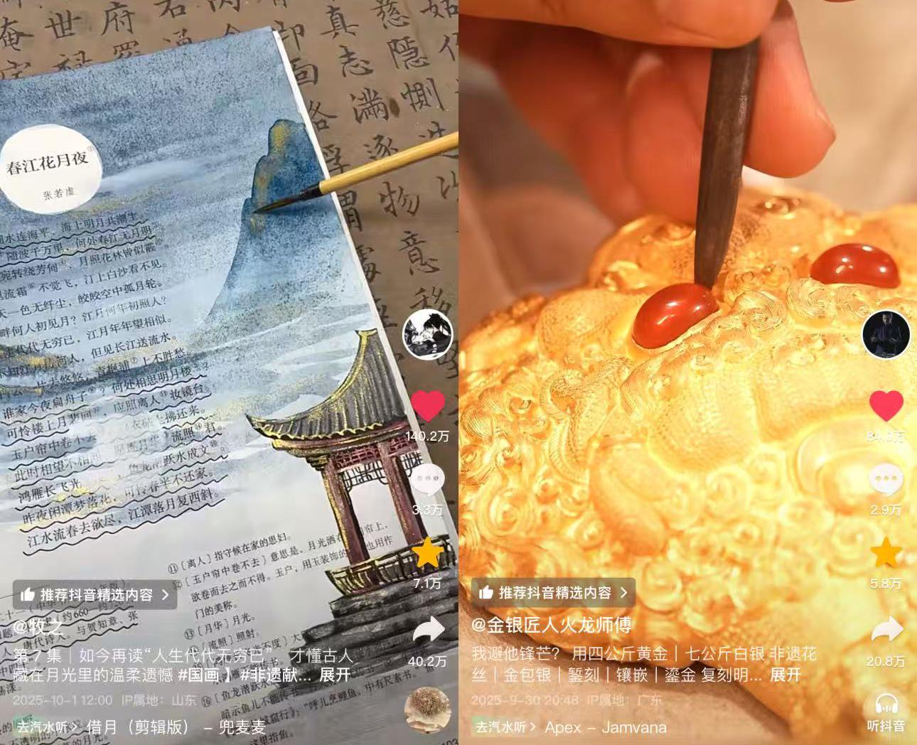 @牧之 用国画在课本上再现千年前古人借春日夜景传递的温柔意象。一江春水,满枝桃花,在熟悉的纸张上洇开一凼月光,道尽缠绵又婉转的思绪,获赞140.2万。@金银匠人火龙师傅 用四公斤黄金和七公斤白银复刻古兵器“永乐剑”,通过非遗花丝、金包银、錾刻、镶嵌、鎏金等传统手工技艺再现名剑神韵,不仅还原了剑身的凌厉线条和纹饰的细腻质感,更让冰冷的金属化作历史的载体,传递匠人精神与潇洒意气,获赞84万。