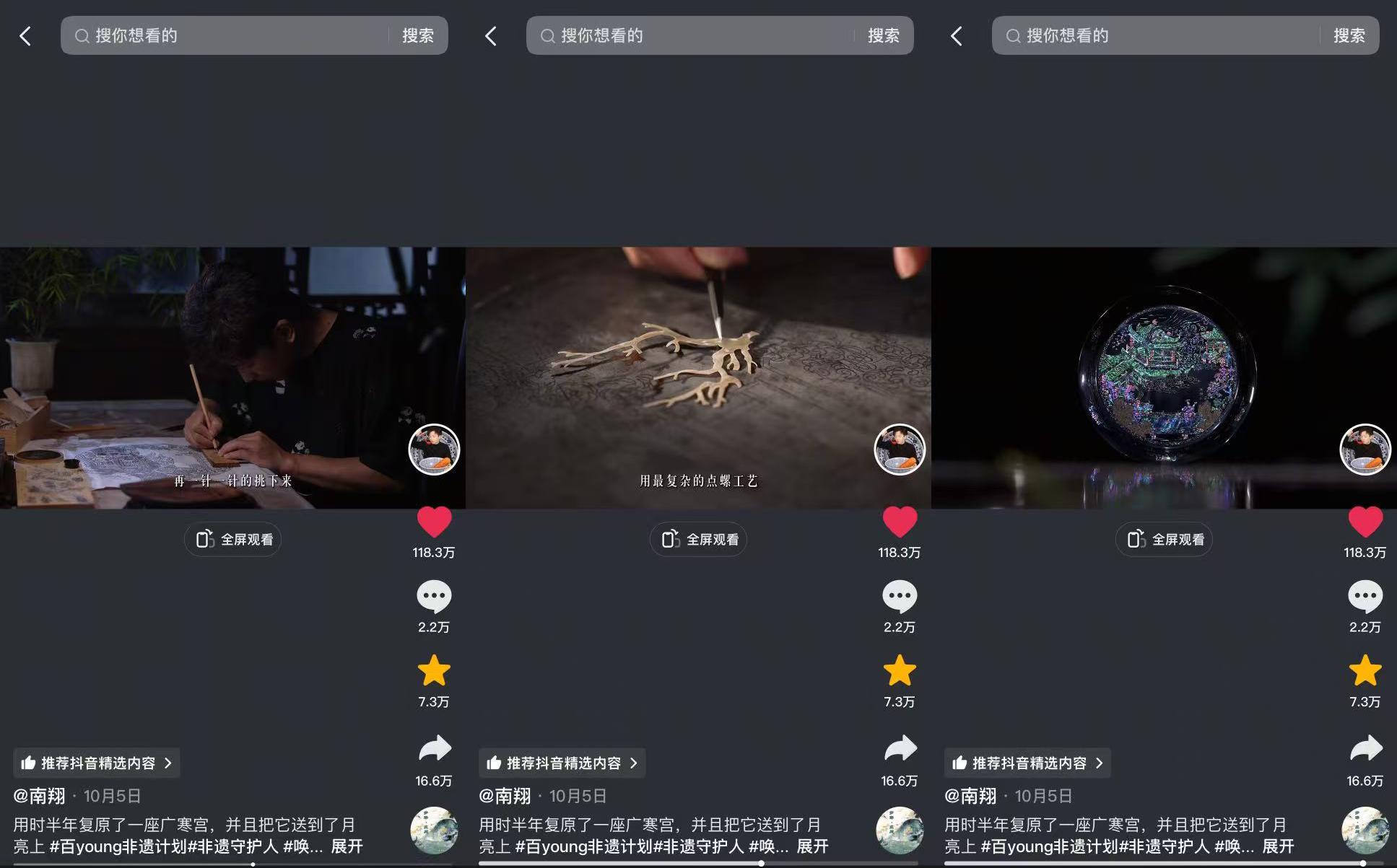 而本季「百young非遗计划」,除聚合上述非遗产物的相关视频内容外,还聚焦“螺钿”这项璀璨千年的镶嵌技艺,联动头部非遗达人@南翔 担任内容启动官,推出定制大片。视频紧贴时节氛围,通过螺钿技艺复刻中秋经典意象“广寒宫”,不仅再现传统工艺之精粹,更赋予非遗以强烈的时代感知与情感连接,让东方美学照进大众视野,再生华光。