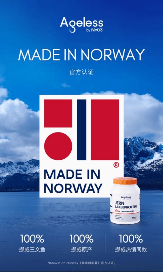 对于食品与营养品牌产品的认证标准尤其严格:企业必须确保至少 80% 的可计入原料来自挪威,且关键加工环节必须在挪威本土完成,以保证纯正产地属性与生态可持续性。Ageless挪威三文鱼铁采用可持续三文鱼铁原料,从原料捕捞、加工提取到成品封装均在挪威完成,完全契合“Made in Norway”的严格标准,并成为同品类首个且唯一获此认证的产品。