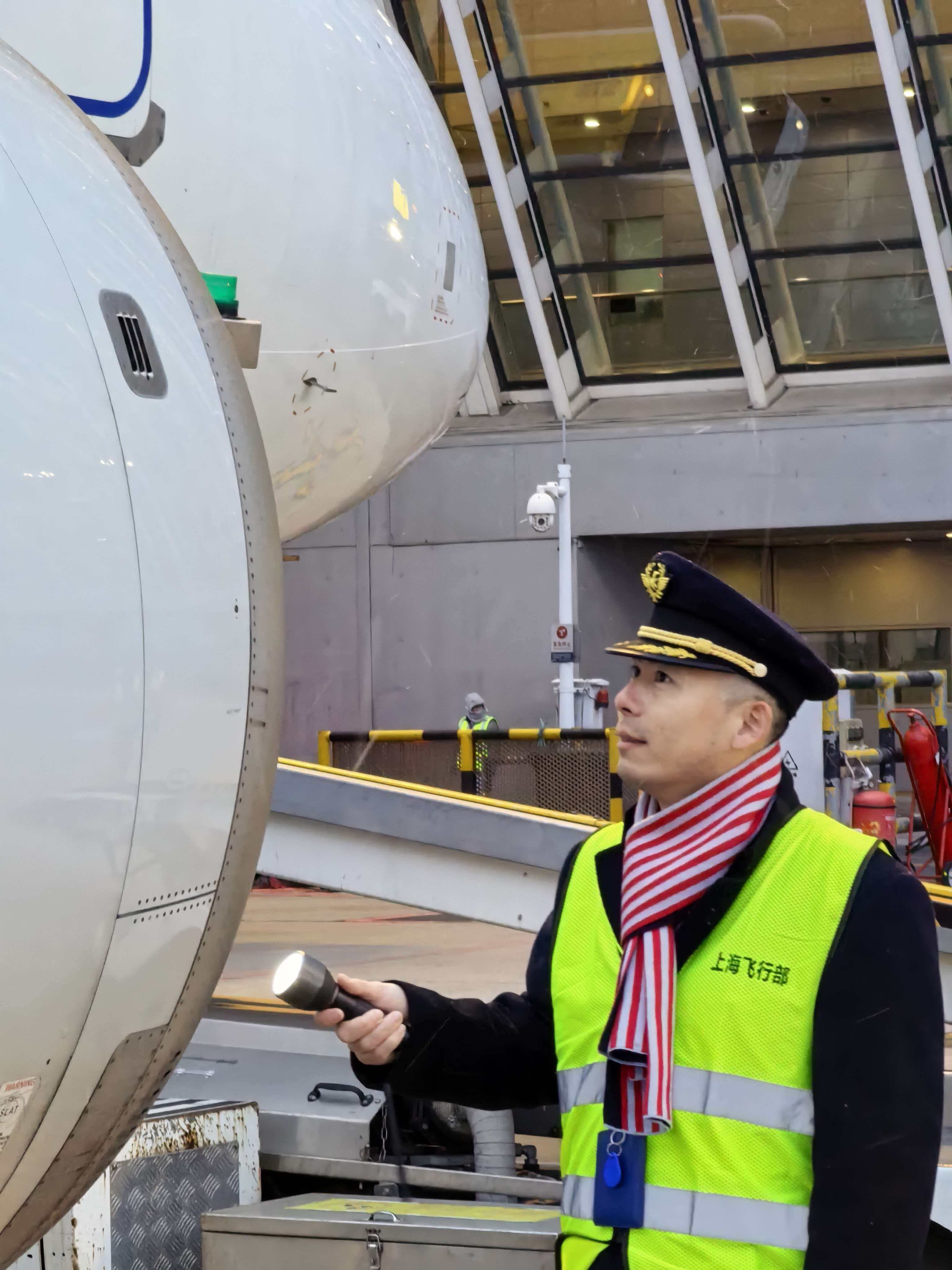 1月20日清晨,东航MU5053(上海-大邱)航班的薛凡艺机组冒着寒冷和雨雪进行起飞前准备工作。他们认真检查飞机,做到不出现任何差错、不遗漏任何死角