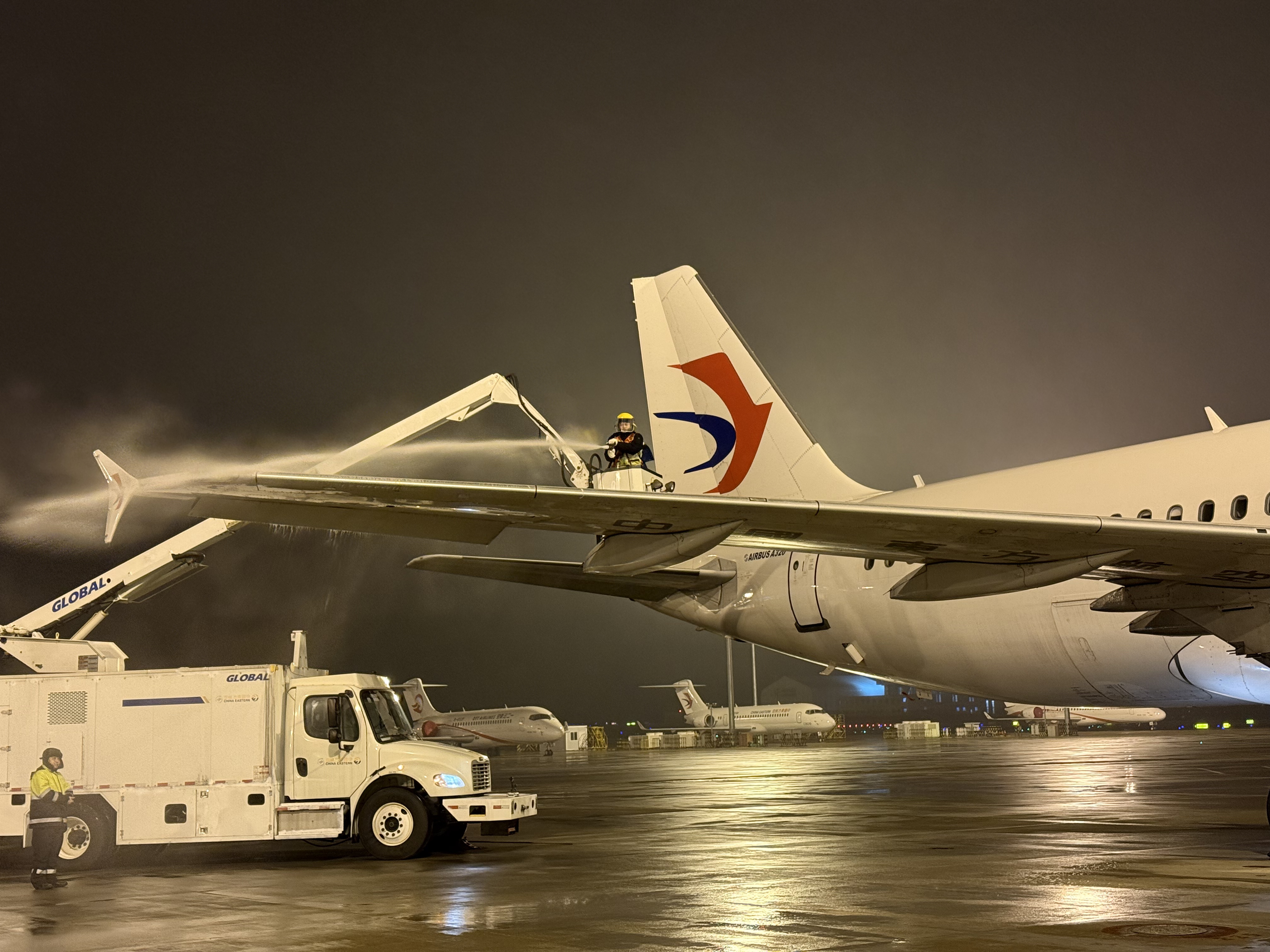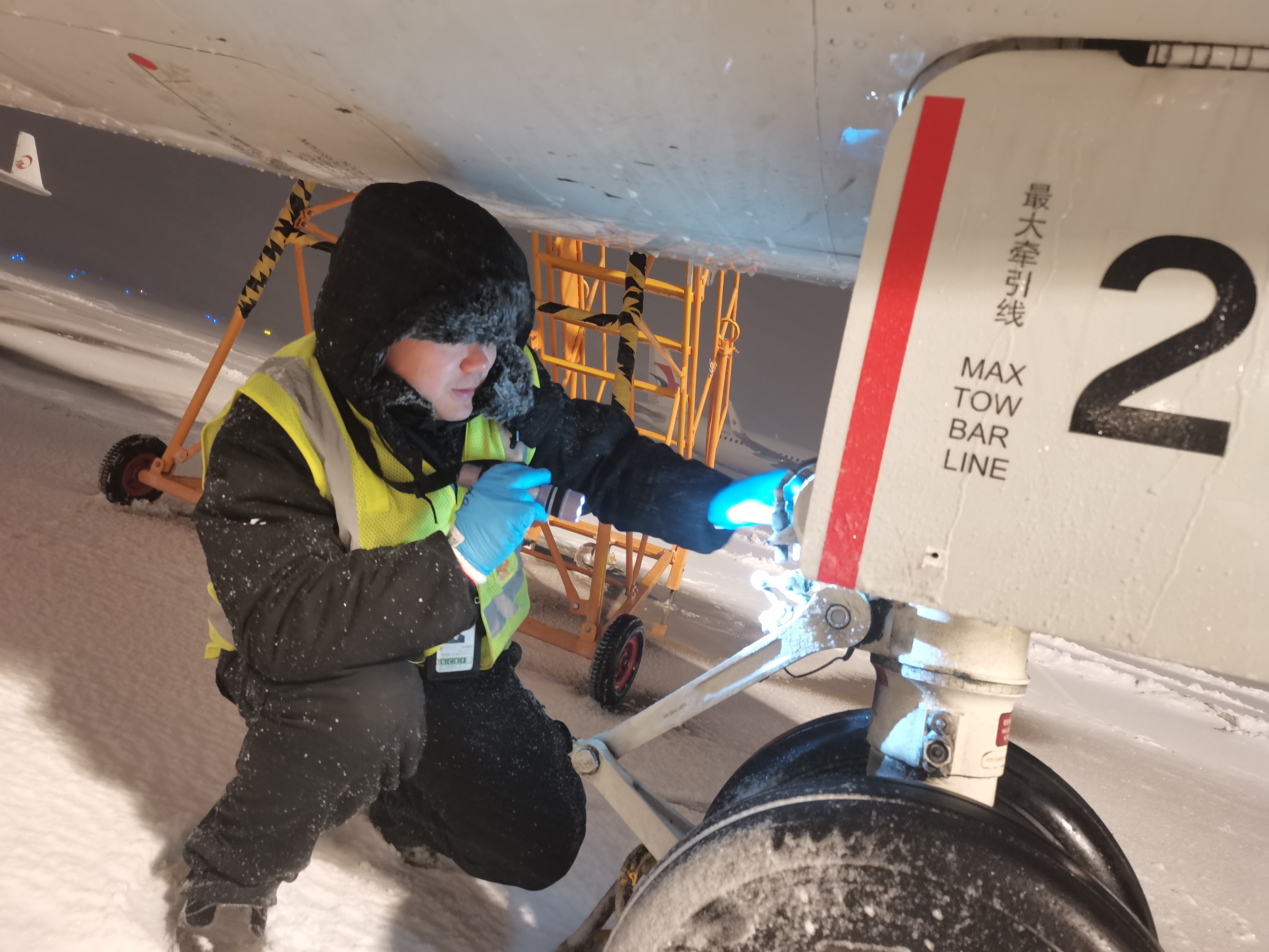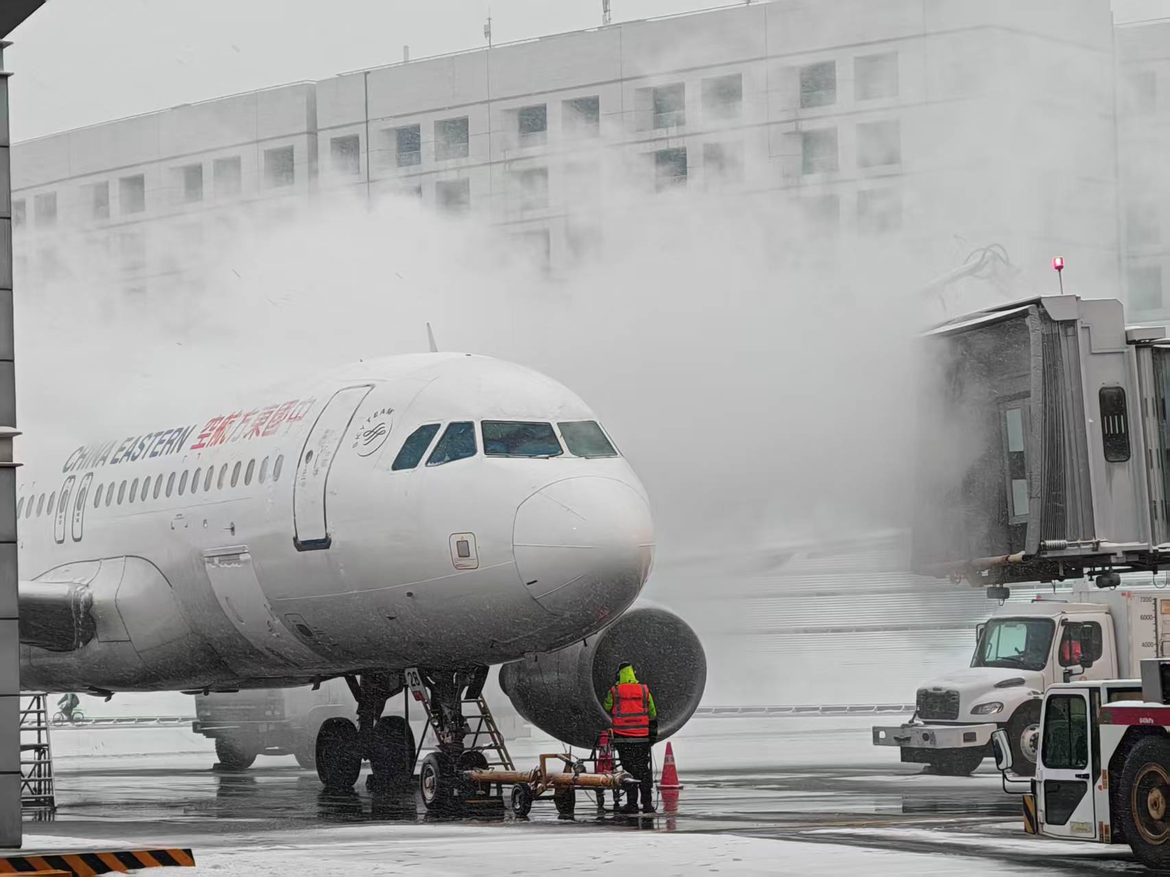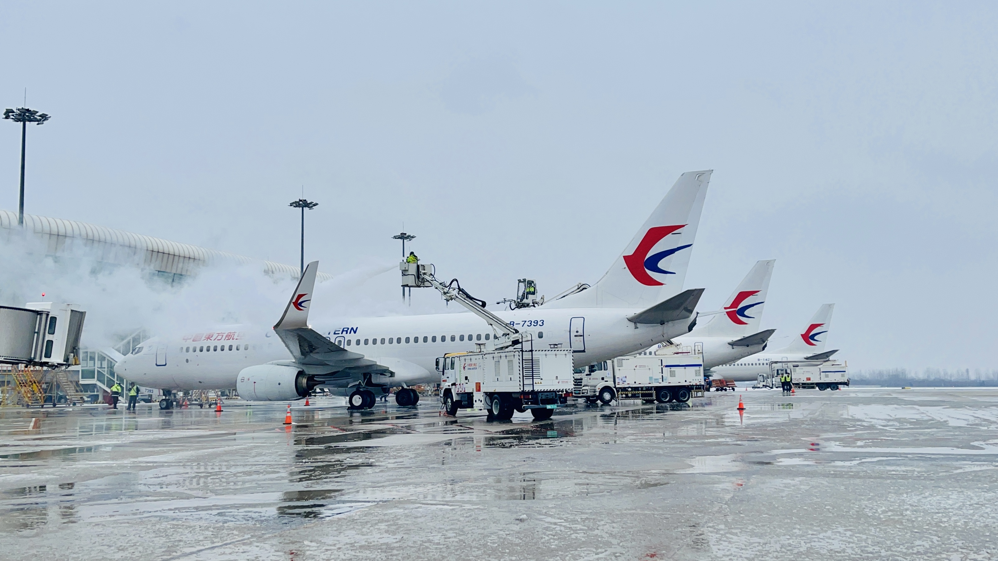东航机务系统加强一线力量,重点做好航空器除防冰工作,确保飞机适航安全。东航技术浦东维修基地在寒潮来临前夕就已提前部署就位了除防冰设施设备、开展了人员冬季运行培训,并特别加强对飞机轮胎、舵面、发动机等关键零部件的检查。20日上午,上海迎来今冬首场降雪,截至11时,虹桥、浦东机场已高效完成飞机除防冰作业134批次,保障航班起降323架次,航班运行整体平稳顺畅。