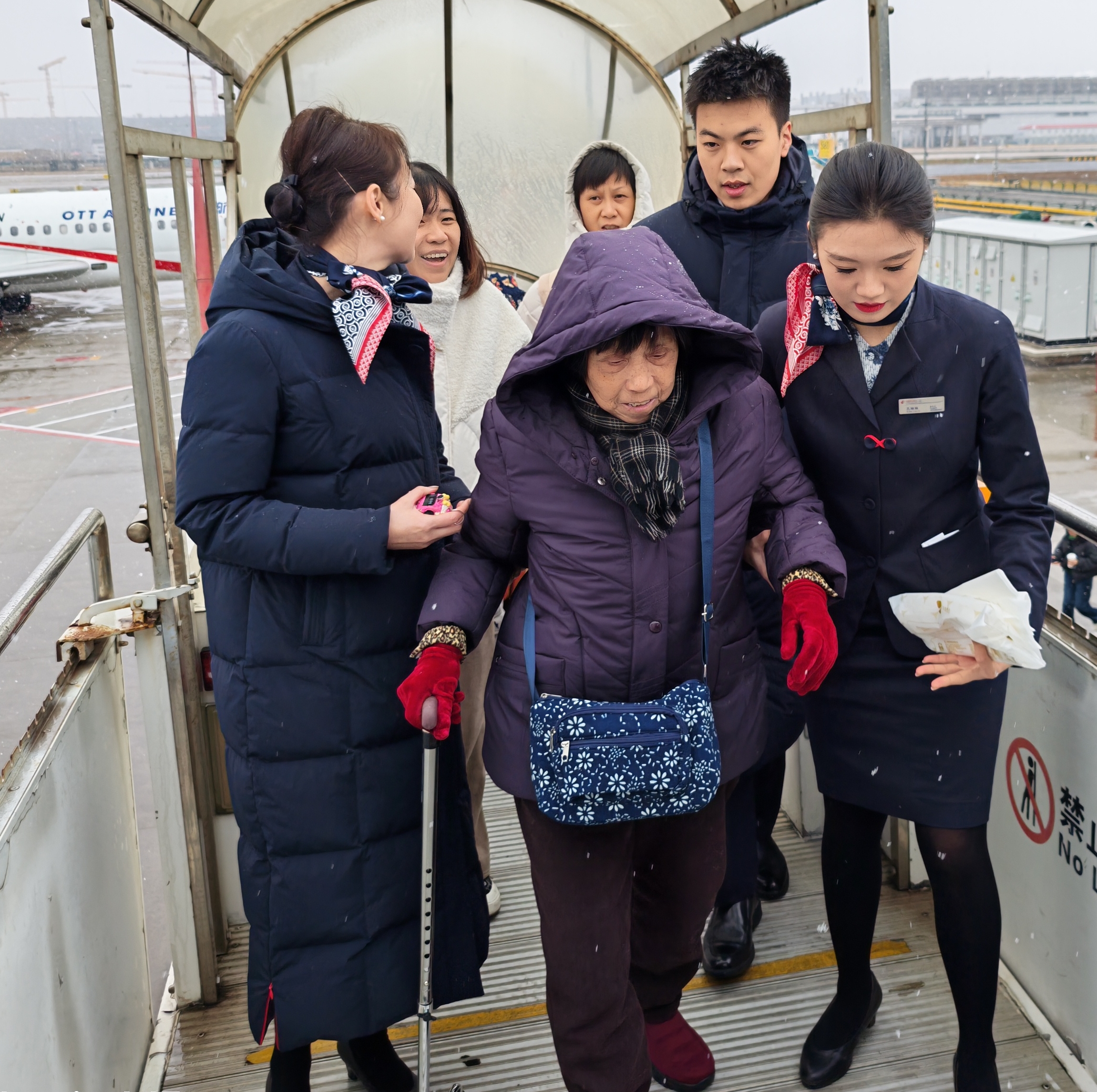 1月20日MU5405浦东-成都,浦东机场下起大雪,东航乘务员搀扶旅客缓慢步行上客梯车登机