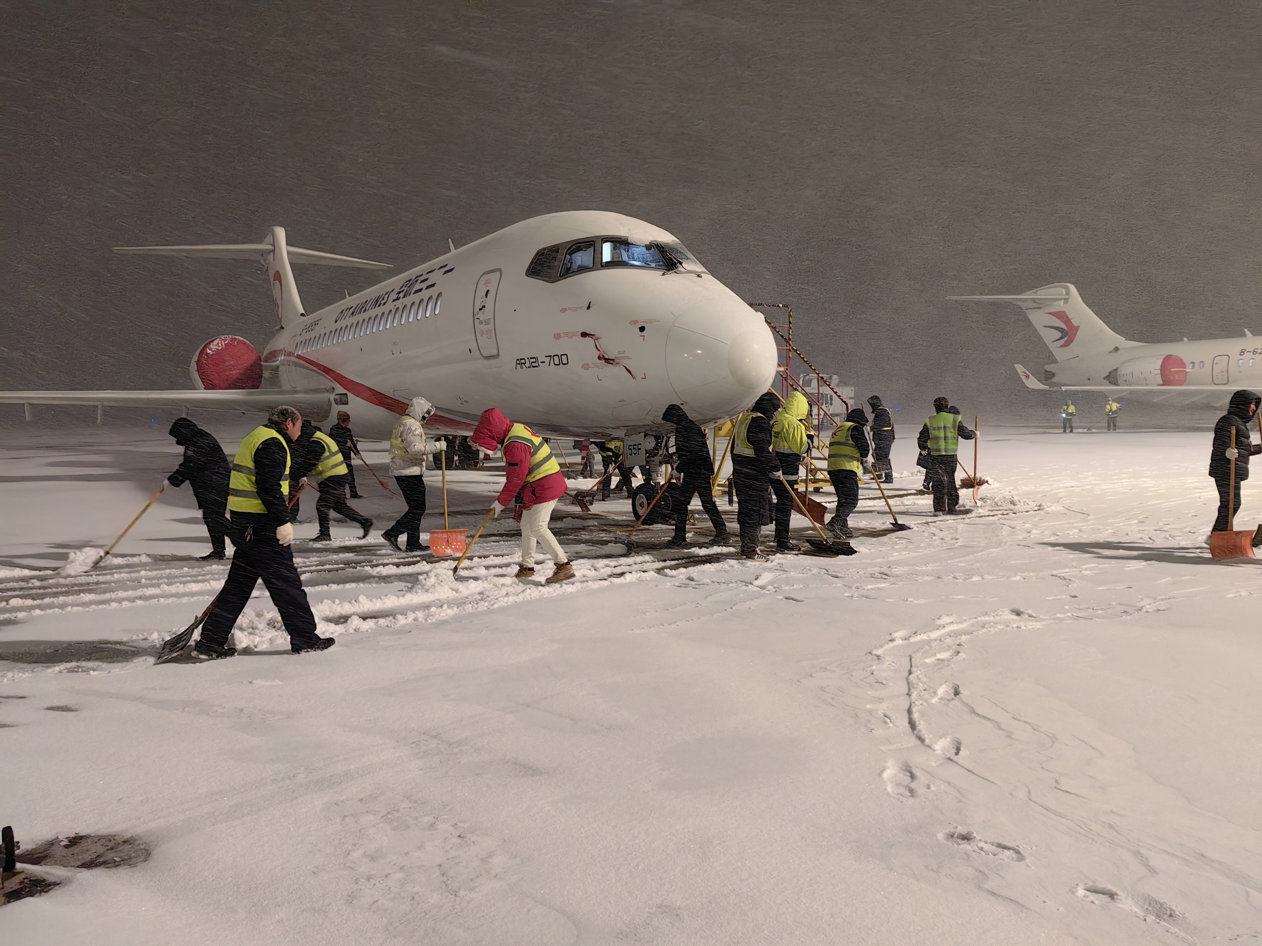 1月19日夜间,合肥地区突降暴雪给航班运行带来极大困难。安徽分公司成立扫雪突击队,为夜间航班保驾护航,全员参与齐上阵,在机坪开展扫雪保障行动