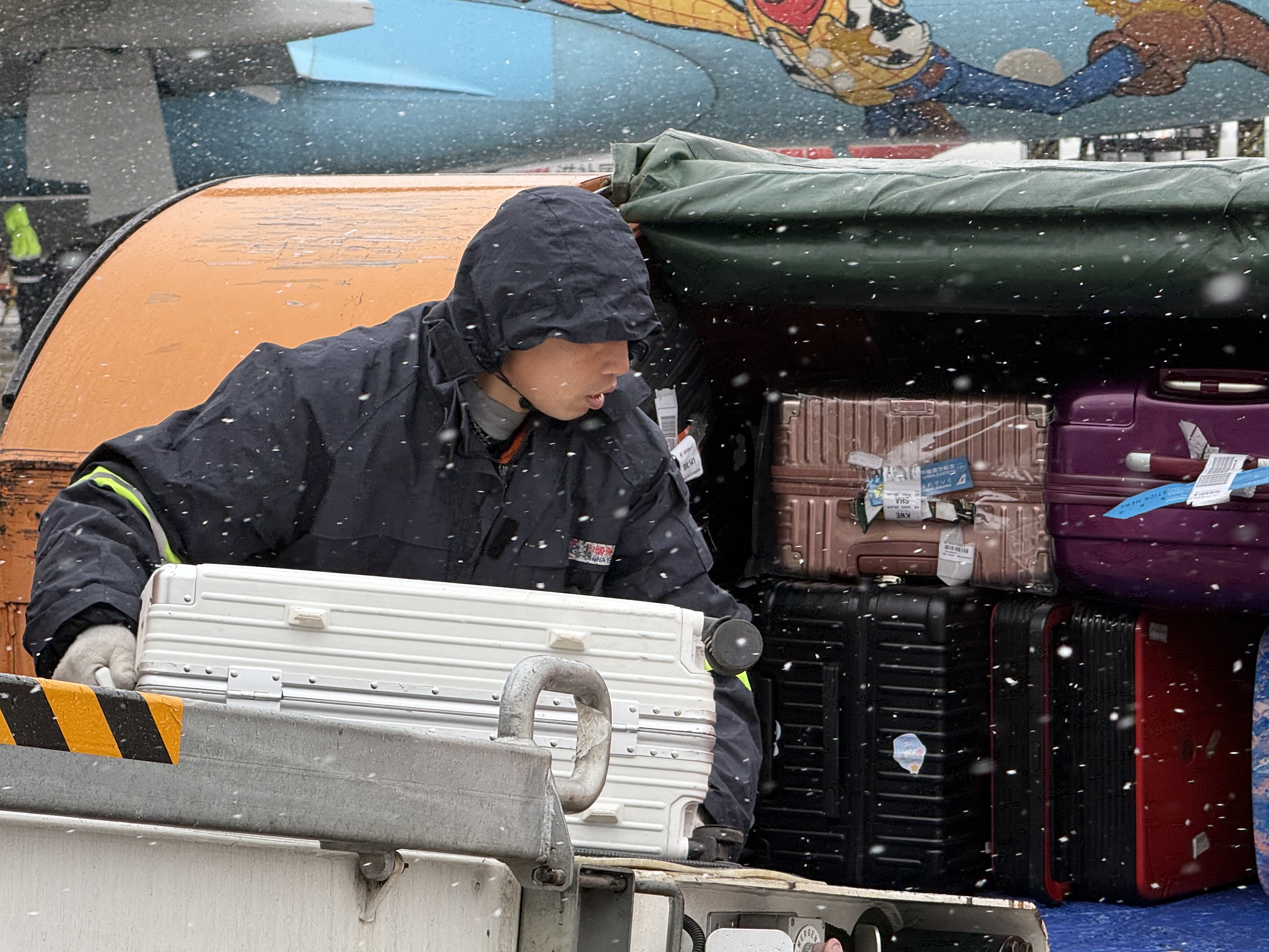 虹桥机场机坪内,地服人员正在风雪中搬运行李