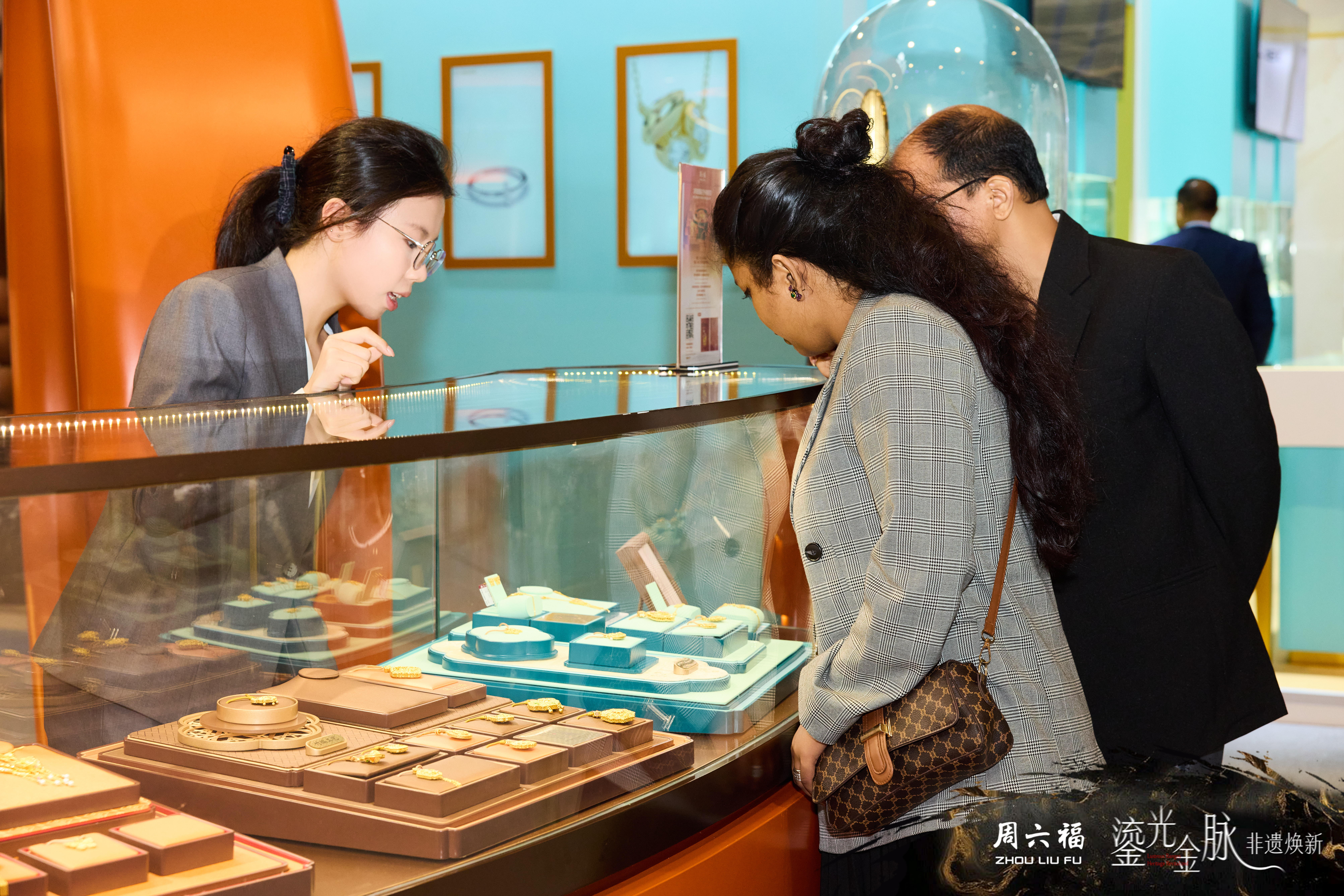 展品展出期间,周六福鎏光金脉珠宝艺术空间吸引了众多行业嘉宾、主流媒体及知名达人前来参观。嘉宾游客们近距离欣赏“见宝非遗”系列产品的匠心巧思,现场品鉴交流氛围热烈,共同见证非遗技艺的焕新时刻。