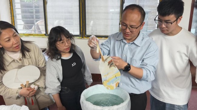 作为本次活动的重点环节,漆扇制作大家首先学习了漆扇的历史渊源与制作技巧,在工作人员指导下,大家纷纷动手,将颜料滴入水中,轻轻搅动出纹理,再将素扇缓缓浸入,通过旋转、摇摆等手法,让五彩的漆液自然附着于扇面。有人以蓝绿为主色调,寓意青春与生机;有人融入红色元素,象征薪火相传。