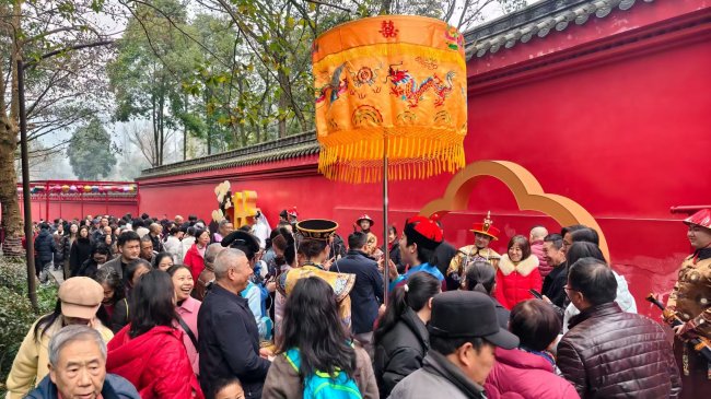 今年,刚刚于2026年1月1日起永久免费开放的报国寺,在这个春节化身为连接宫廷雅韵与巴蜀风情的“文化会客厅”。踏入第一山亭广场,张灯结彩的喜庆氛围扑面而来,红墙金瓦的紫禁城元素与峨眉山的灵秀风光交相辉映,不少市民游客已慕名前来打卡留念,提前感受南北交融的独特年味。