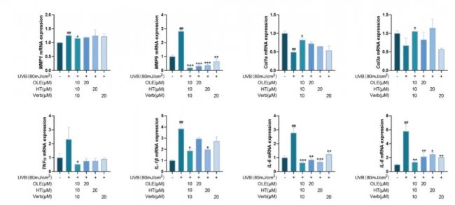 ▲油橄榄叶中三种核心多酚的协同抗光老化实验数据图示