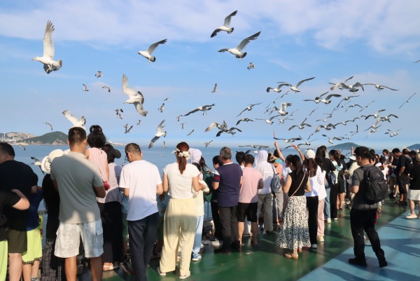 撒一把饲料,群鸥翩然掠舷。