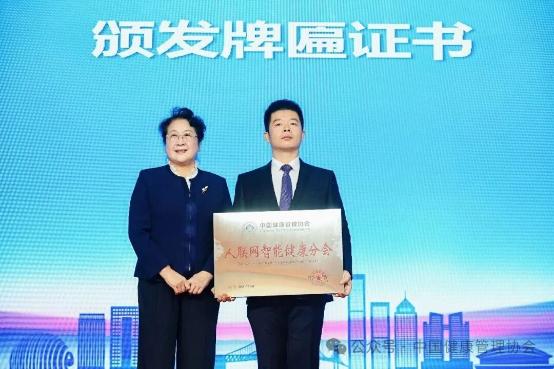 协会书记、常务副会长郝燕燕,监事长郭齐祥为人联网智能健康分会颁发牌匾,并为新当选的第一届委员会主任委员、副主任委员及总干事颁发证书。